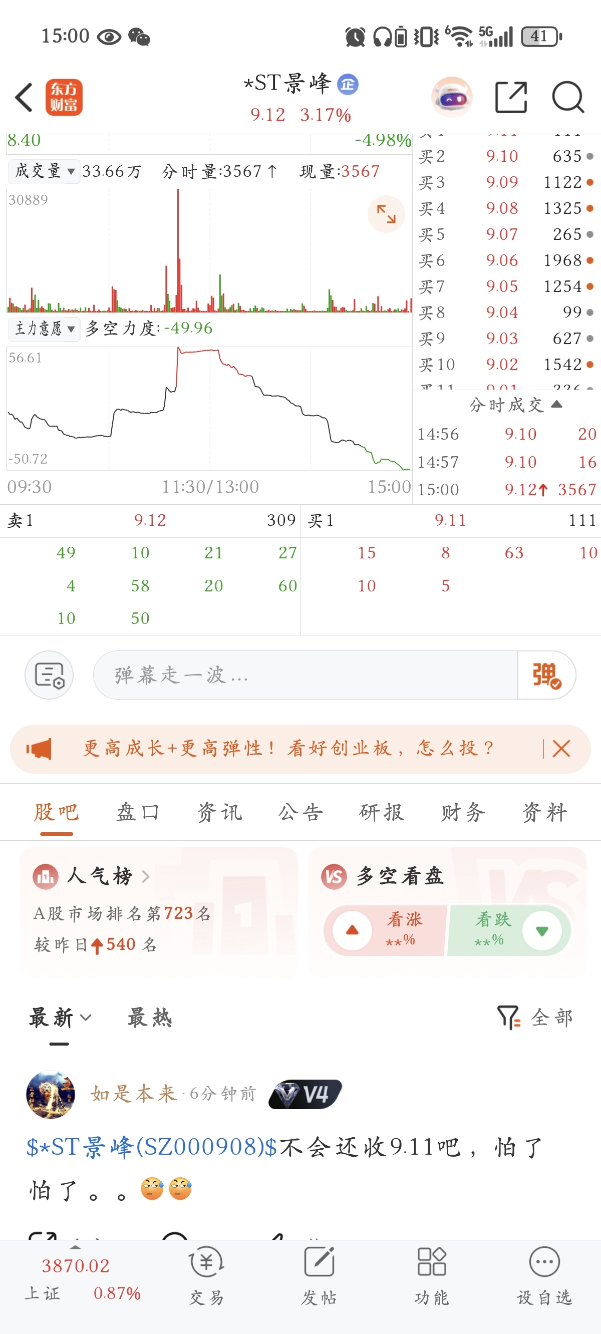 $*ST景峰(SZ000908)$ 最后竞价3536偷吃,今天就是庄家骗筹码的一天,持股不动