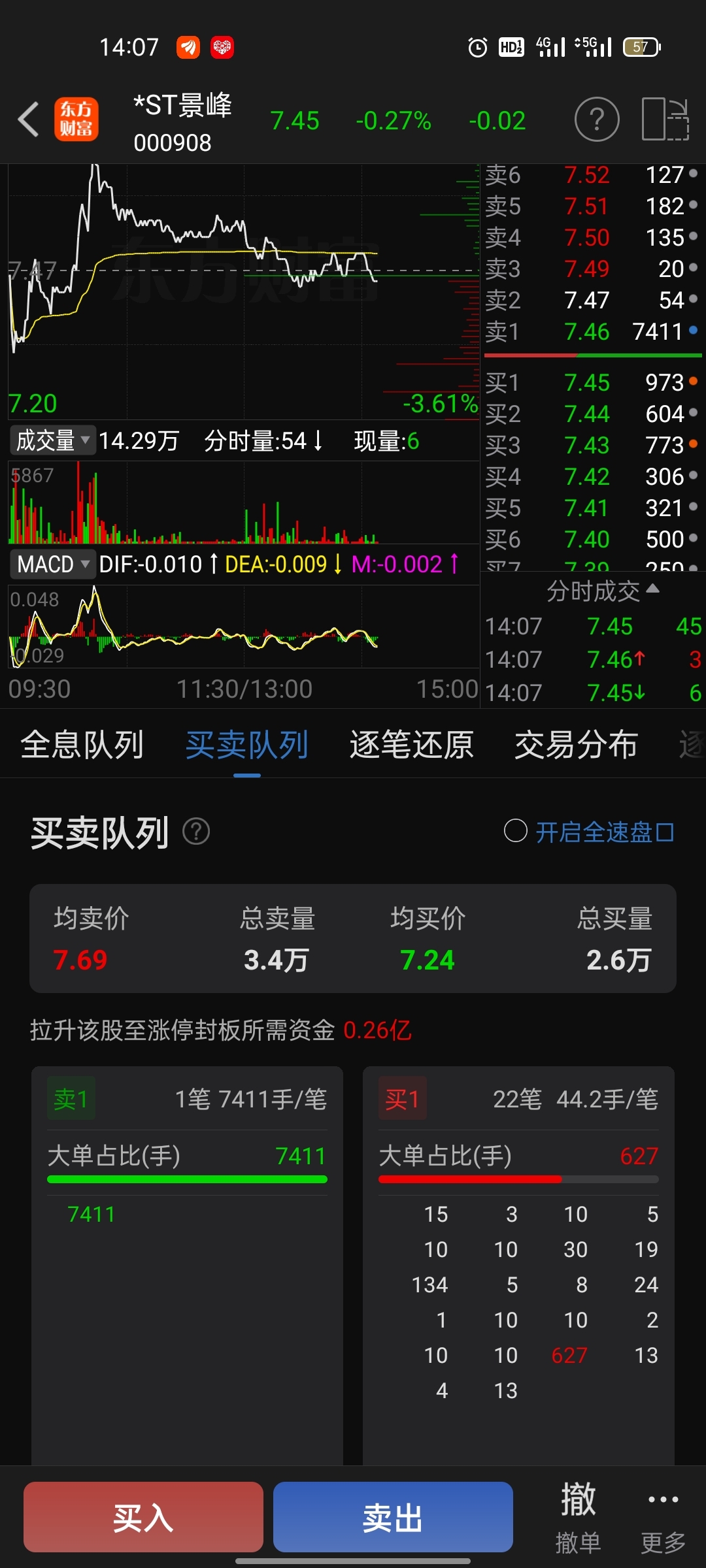 $*ST景峰(SZ000908)$ 主力大哥,你要诚心想卖,少挂一分钱7.45就卖出去了,7.46卖一挂7400手恶心谁,何必呢。