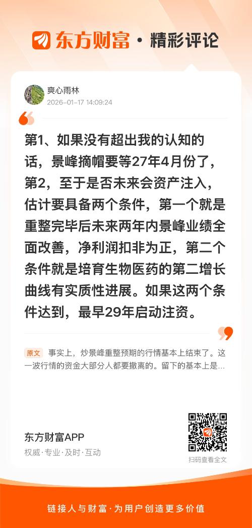 好//@爽心雨林 : 第1、如果没有超出我的认知的话,景峰摘帽要等27年4月份了,第2,至于是否未来会资产注入,估计要具备两个条件,第一个就是重整完毕后未来两年内景峰业绩全面改善,净利润扣非为正,第二个条件就是培育生物医药的第二增长曲线有实质性进展。如果这两个条件达到,最早29年启动注资。