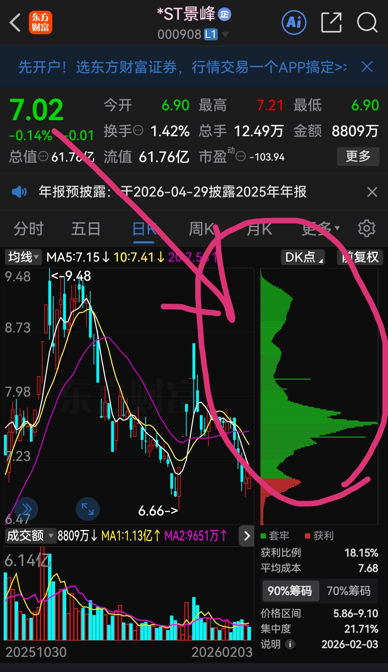 $*ST景峰(SZ000908)$ 转增除权后,上面还有这么多筹码等解套。