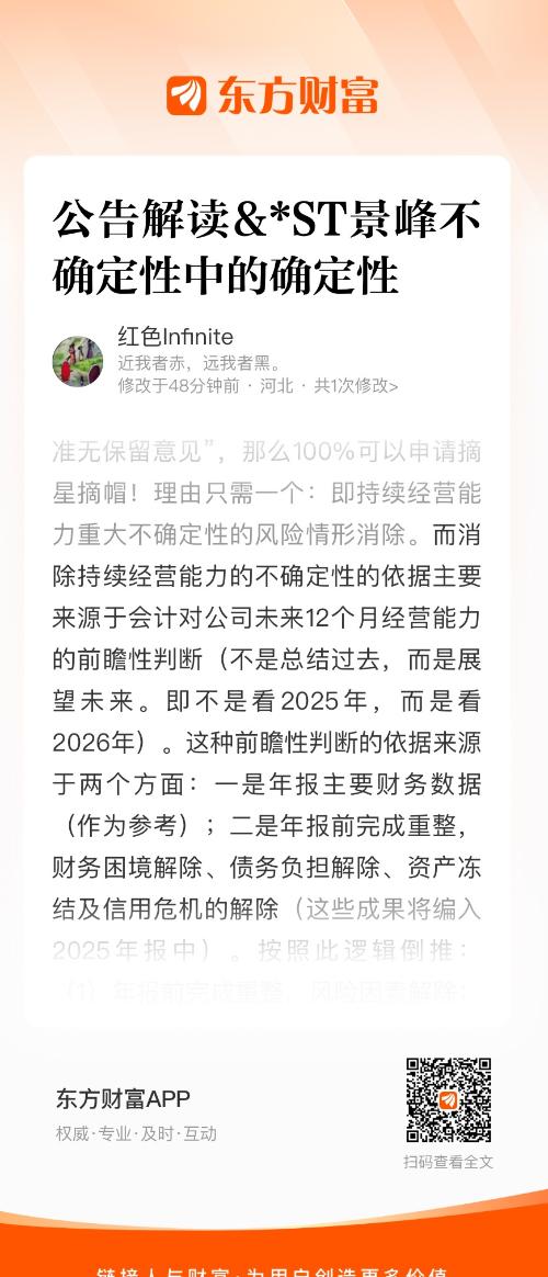 需要强调的是:如果年报审计出具“标准无保留意见”,那么100%可以申请摘星摘帽!理由只需一个:即持续经营能力重大不确定性的风险情形消除。而消除持续经营能力的不确定性的依据主要来源于会计对公司未来12个月经营能力的前瞻性判断(不是总结过去,而是展望未来。即不是看2025年,而是看2026年)。这种前瞻性判断的依据来源于两个方面:一是年报主要财务数据(作为参考);二是年报前完成重整,财务困境解除、债务负担解除、资产冻结及信用危机的解除(这些成果将编入2025年报中)。按照此逻辑倒推:(1)年报前完成重整,风险因素解除;且2025年财务数据(根据前三季度报和年报预告)不存在触及退市风险和其它风险警示的情形→(2)经营能力不确定性消除→(3)审计为标准无保留意见→(4)申请摘星摘帽。