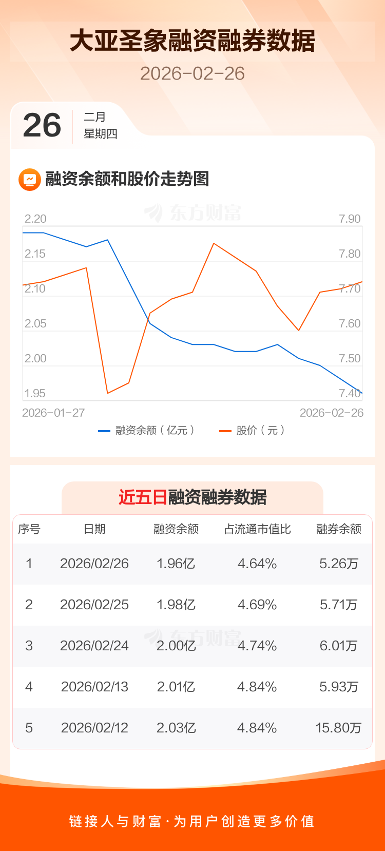 交易所最新数据显示,大亚圣象于2026年2月26日获融资买入224.40万元,融资偿还377.72万元,当日融资净偿还153.32万元。目前,该股融资余额1.96亿,占流通市值比例为4.64%。