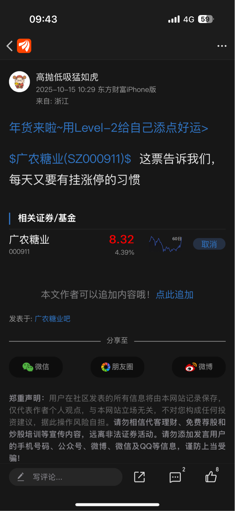 温馨提示: 1.根据《证券法》规定,禁止编造、传播虚假信息或者误导性信息,扰乱证券市场;2.用户在本社区发表的所有资料、言论等仅代表个人观点,与本网站立场无关,不对您构成任何投资建议。用户应基于自己的独立判断,自行决定证券投资并承担相应风险。《东方财富社区管理规定》