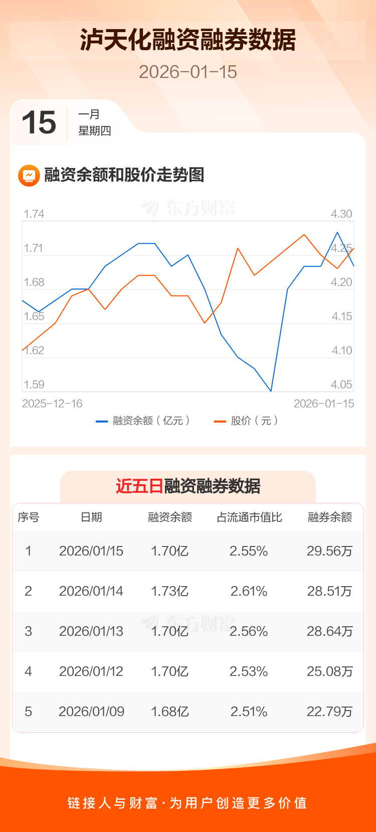 交易所最新数据显示,泸天化于2026年1月15日获融资买入481.68万元,融资偿还714.39万元,当日融资净偿还232.71万元。目前,该股融资余额1.70亿,占流通市值比例为2.55%。
