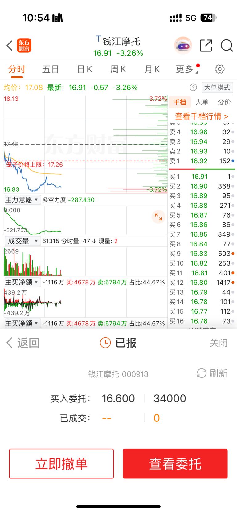 $钱江摩托(SZ000913)$ 挂点不会成交的单子过过瘾
