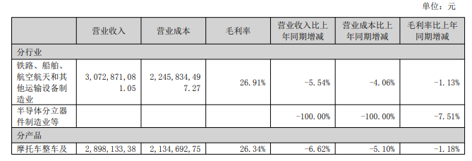 半年报显示,公司核心营收支柱——摩托车整车及电动自行车,尽管贡献了九成以上的营业收入,但在报告期内收入同比下滑6.62%,且毛利率亦同步下降1.18%;去年同期曾创造677.23万元收入的半导体分立器件制造业,上半年骤降至零。