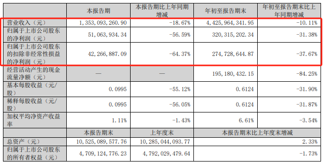 其中,第三季度,公司实现营收13.53亿元,同比下降18.67%;归母净利润为5106.39万元,同比下降56.59%;扣非净利润为4226.69万元,同比下降64.37%。