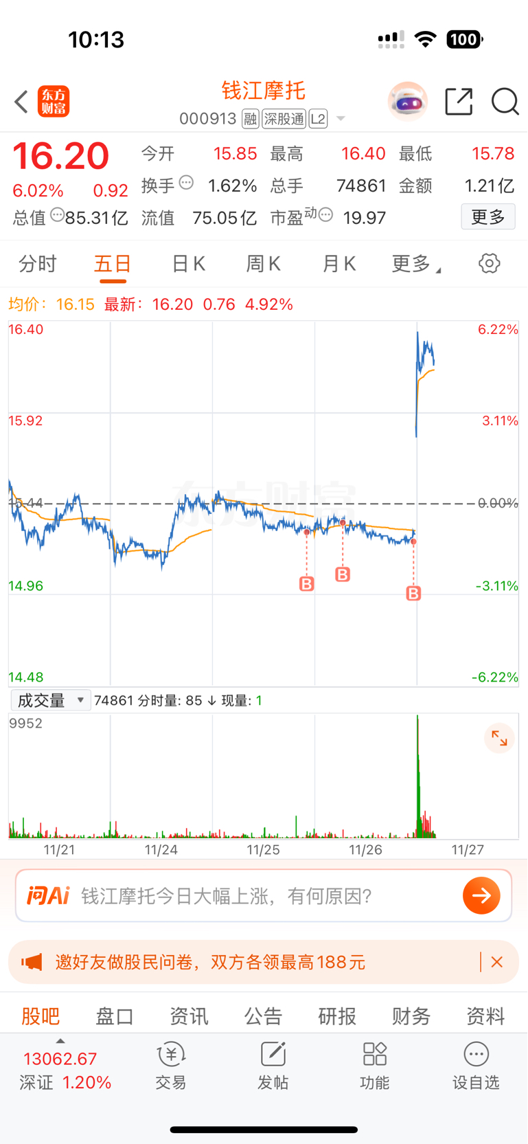 $钱江摩托(SZ000913)$ 哎哟我去,运气这么好,今晚能ktv了