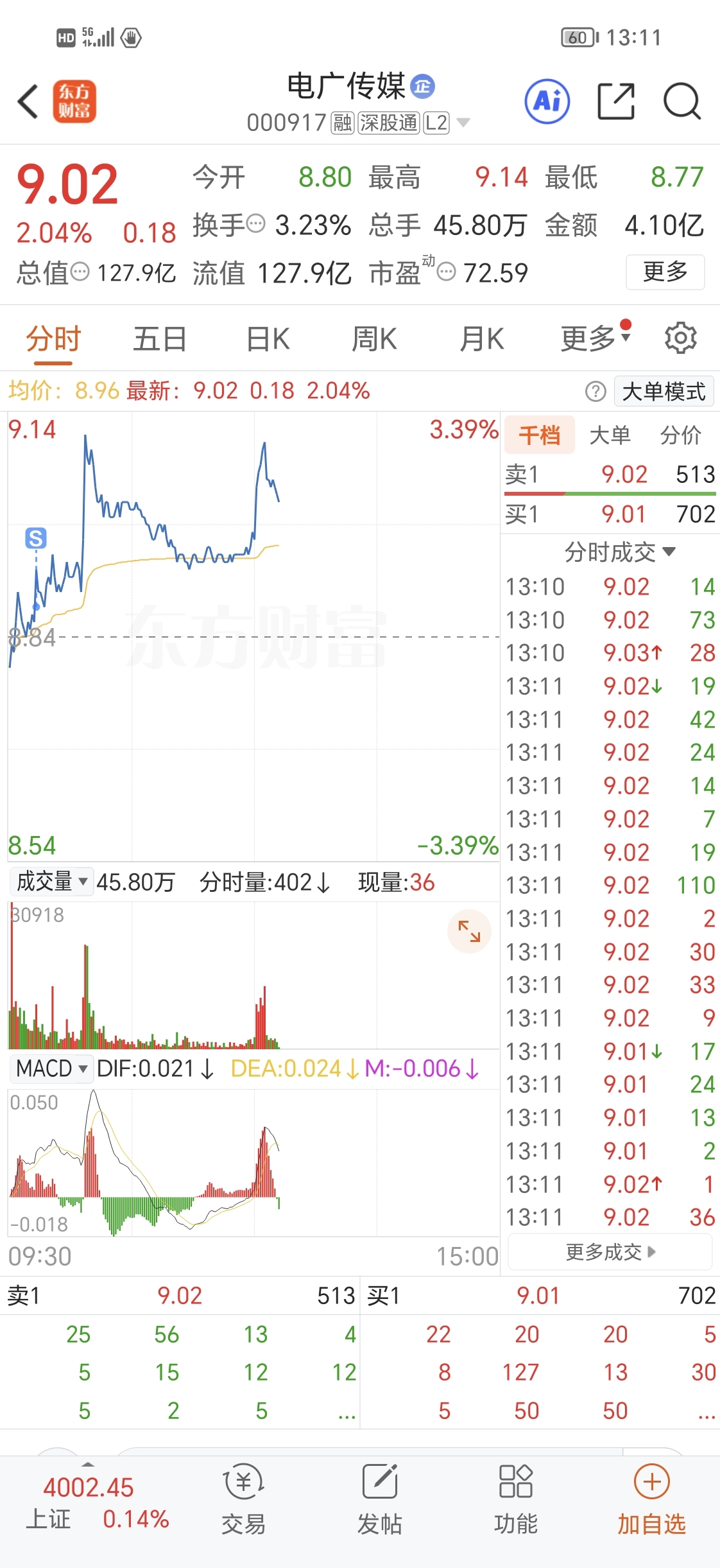 $电广传媒(SZ000917)$ 今天不动又能挣一万多,结果少挣了一半,低点割了所有票。好烦