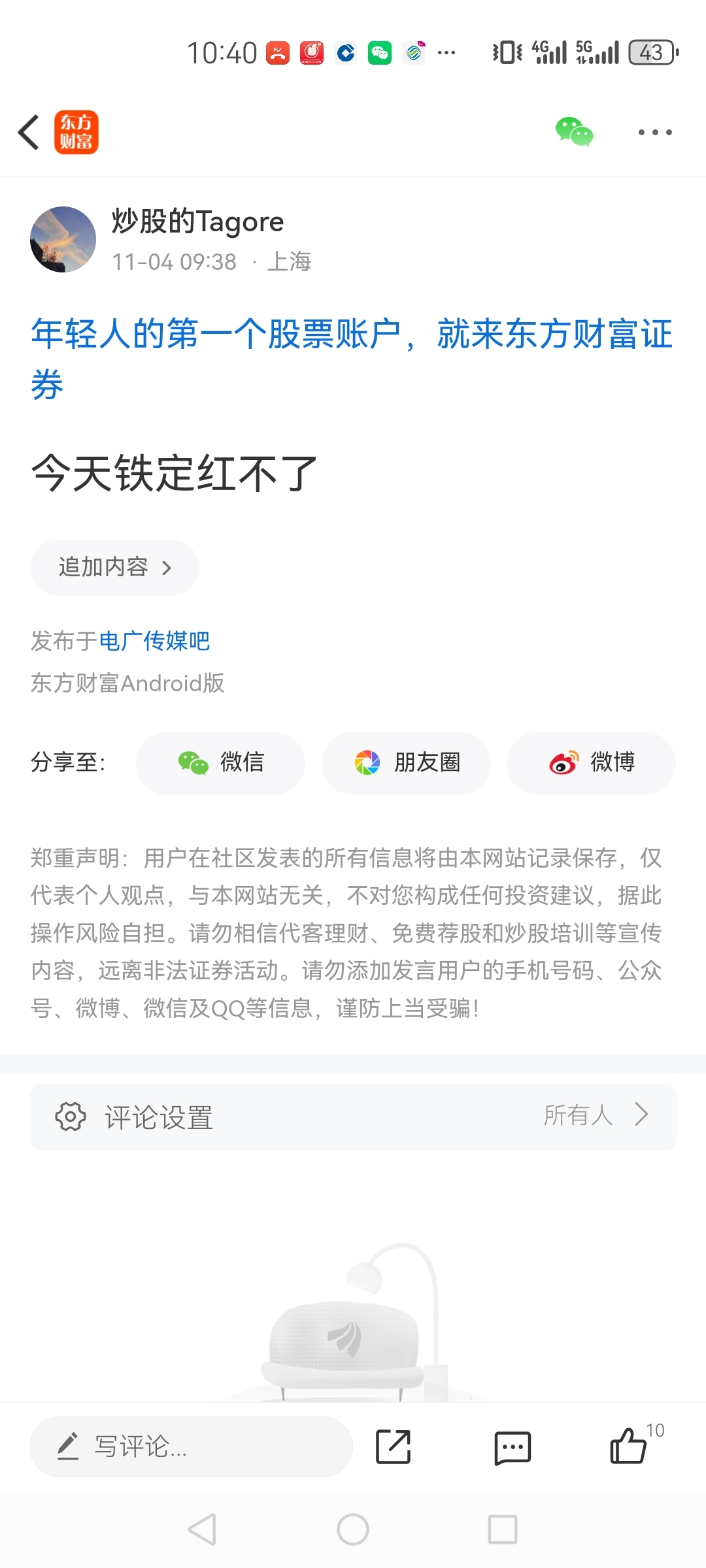 温馨提示: 1.根据《证券法》规定,禁止编造、传播虚假信息或者误导性信息,扰乱证券市场;2.用户在本社区发表的所有资料、言论等仅代表个人观点,与本网站立场无关,不对您构成任何投资建议。用户应基于自己的独立判断,自行决定证券投资并承担相应风险。《东方财富社区管理规定》
