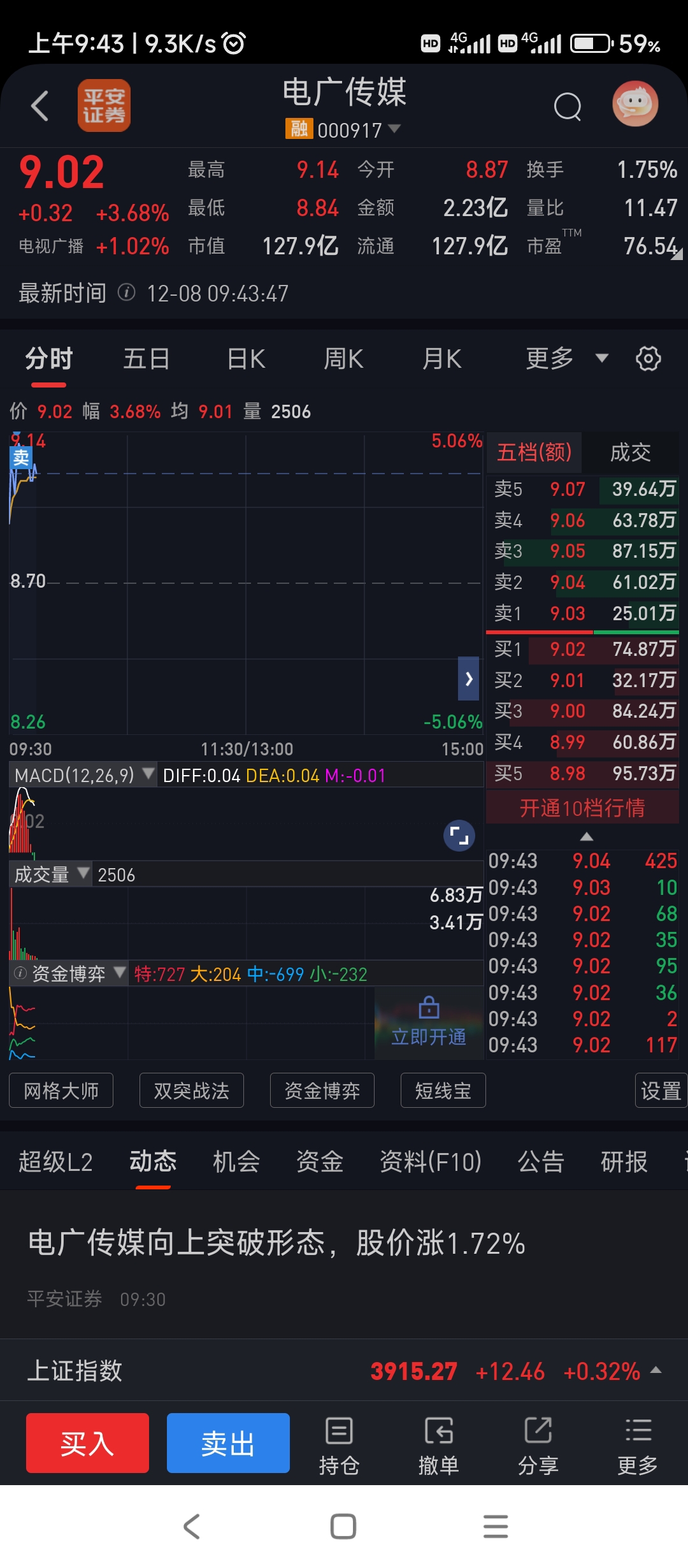 $电广传媒(SZ000917)$ 9.14出来了,准备跳水接回来