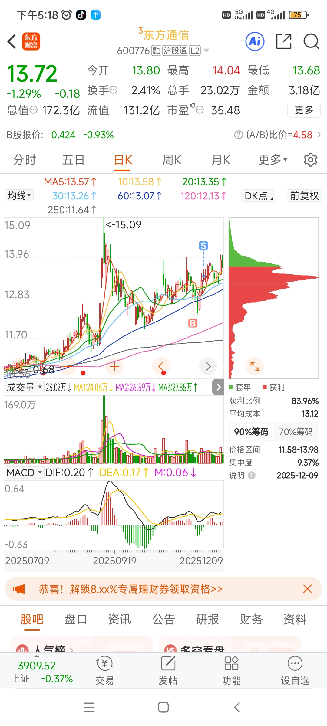 $电广传媒(SZ000917)$ 怕电广要连续回调的,可以去东方通信,即将进入14-15.5最后的洗盘区间,预计1月底突破15.5进入季线级爆涨行情