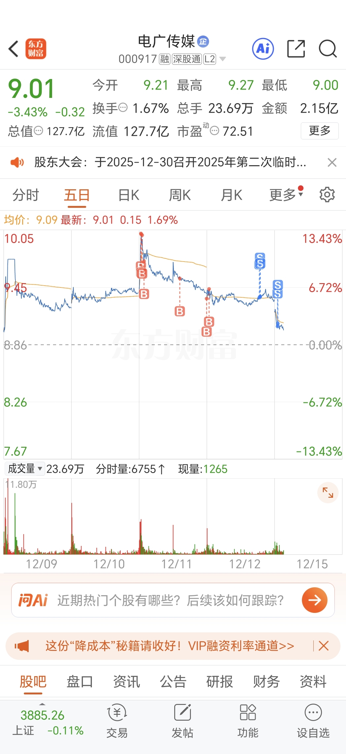 $电广传媒(SZ000917)$ 我不知道为什么,只要想拿长线,大概率大亏。进了这个票这几天亏了一万多。钱都是在龙头上挣得,肉都是自己意银亏出去的。我买科德教育的时候,贴吧里都说中昊芯英上市,我觉得小散户都知道了不可能上市,没想到我卖了以后科德教育连续拉两个20厘米涨停。这次电广我吸取教训不看贴吧了,结果他真的跳水给你看。正反手被主力割韭菜。