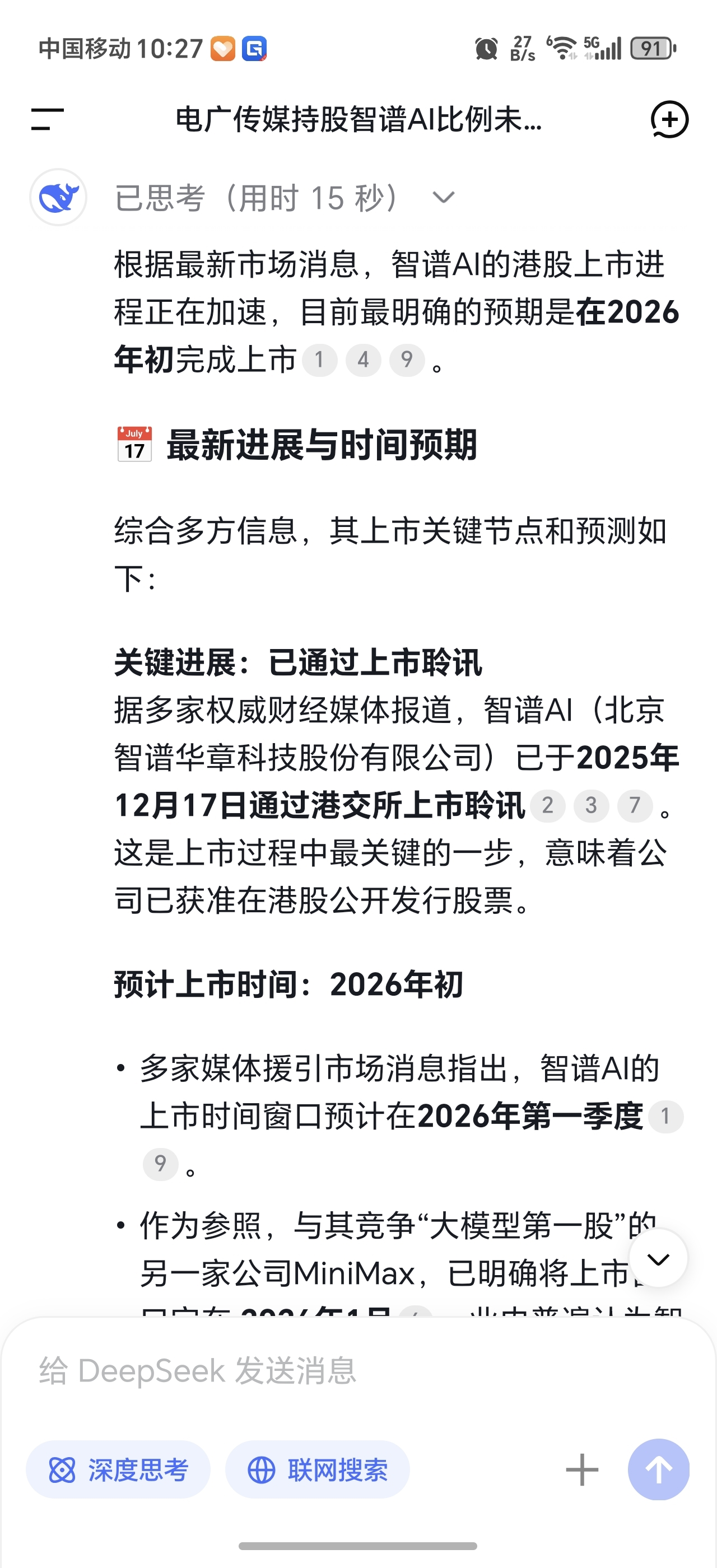 $电广传媒(SZ000917)$ 12月17日智谱AI在港交所通过上市聆讯,通过这一关代表的智谱将确定在2026年一季度在港股正式上市,电广传媒最早持有智谱AI大约7%的股份,后面公司继续融资,可能会有一定的稀释,最终持股多少上市就知道了!