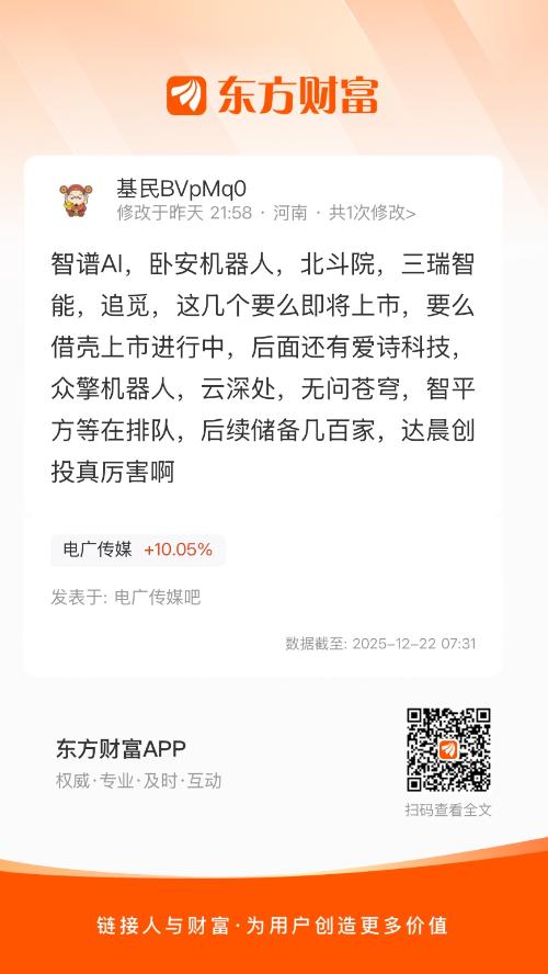智谱AI,卧安机器人,北斗院,三瑞智能,追觅,这几个要么即将上市,要么借壳上市进行中,后面还有爱诗科技,众擎机器人,云深处,无问苍穹,智平方等在排队,后续储备几百家,达晨创投真厉害啊