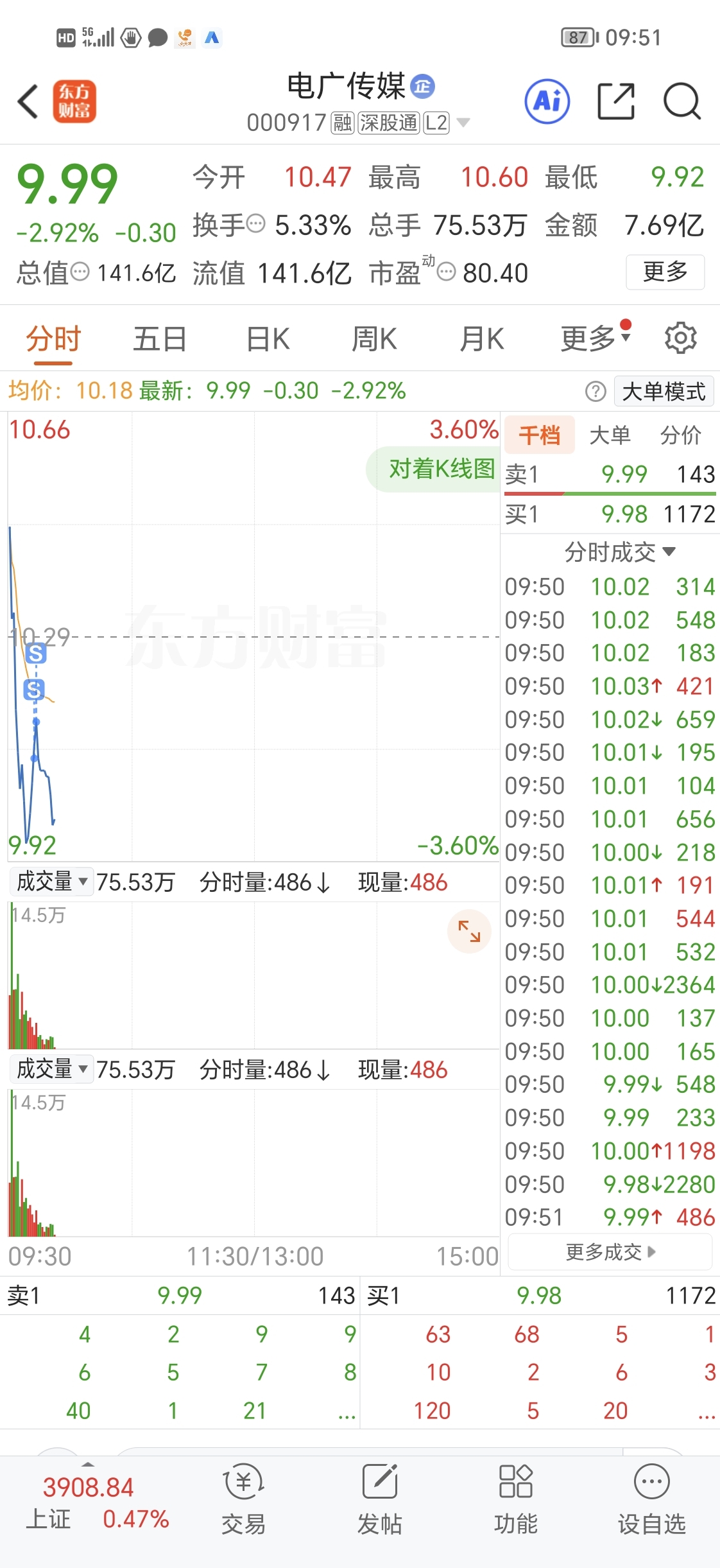 $电广传媒(SZ000917)$ 前几天每天都开盘一分钟卖票,卖了很多大涨。这次你不卖,他就跳水。涨2个点不舍得卖,跌2个点舍得卖了。贪心导致少挣太多