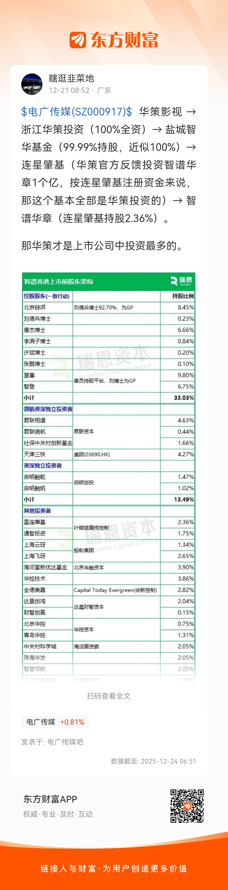 $电广传媒(SZ000917)$ 华策影视 → 浙江华策投资(100%全资)→ 盐城智华基金(99.99%持股,近似100%)→ 连星肇基(华策官方反馈投资智谱华章1个亿,按连星肇基注册资金来说,那这个基本全部是华策投资的)→ 智谱华章(连星肇基持股2.36%)。