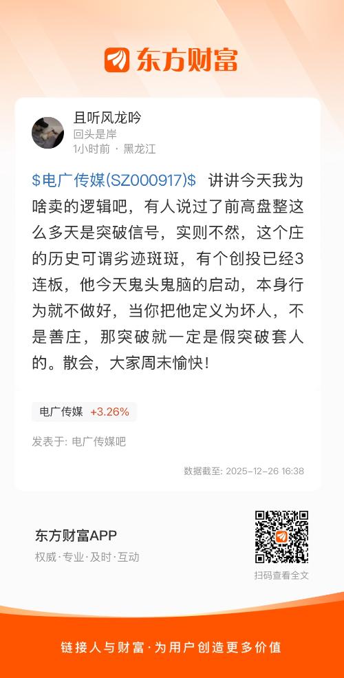 $电广传媒(SZ000917)$ 讲讲今天我为啥卖的逻辑吧,有人说过了前高盘整这么多天是突破信号,实则不然,这个庄的历史可谓劣迹斑斑,有个创投已经3连板,他今天鬼头鬼脑的启动,本身行为就不做好,当你把他定义为坏人,不是善庄,那突破就一定是假突破套人的。散会,大家周末愉快!