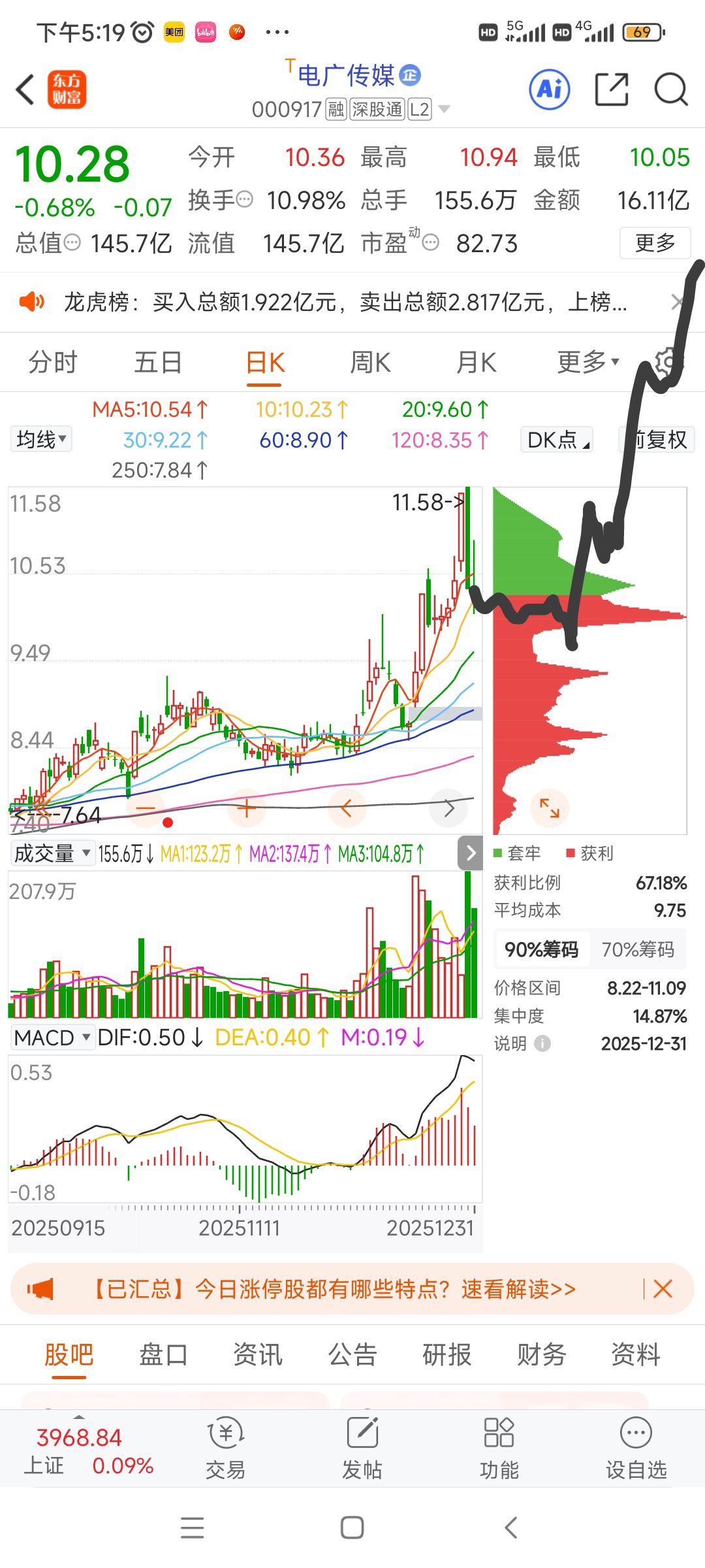 $电广传媒(SZ000917)$ 中性预测走势:在9.8上方震荡8-12个交易日,最后破位下探9.55附近逼走恐慌盘,随后多段拉升至14.33-14.88区间震荡出货——【操作指导:看好但空仓的,等地量或破位诱空出现,坚定看好持有的,留子弹在9.89-9.56加仓,觉得和特力A一样下去睡觉几个月的,近期不用鸟它了】
