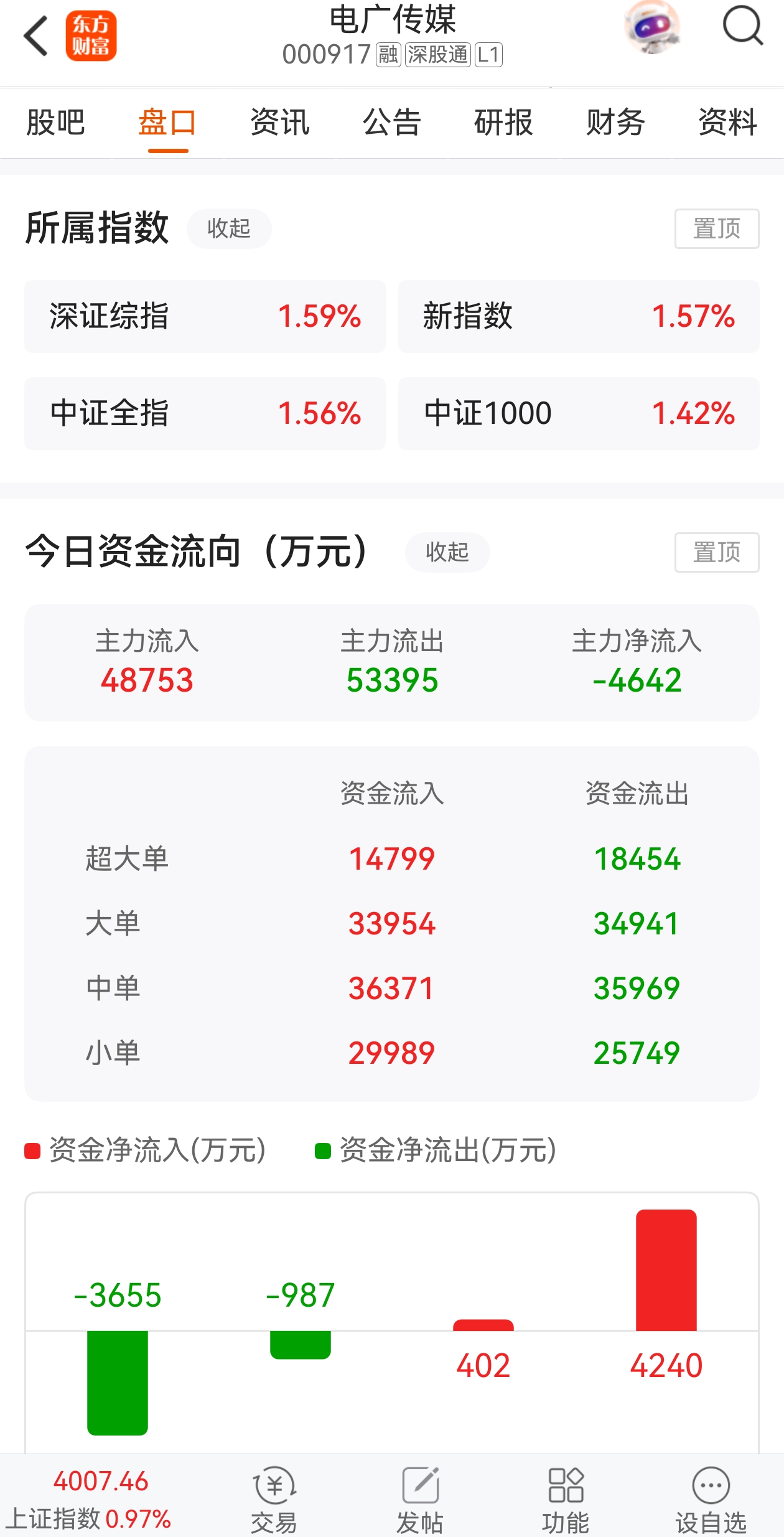 $电广传媒(SZ000917)$ 大盘站上4000点,电广传媒利好叠加,股价放量滞涨,主力资金大幅流出!你说主力在干啥?还在幻想?今天不卖的站岗十年!