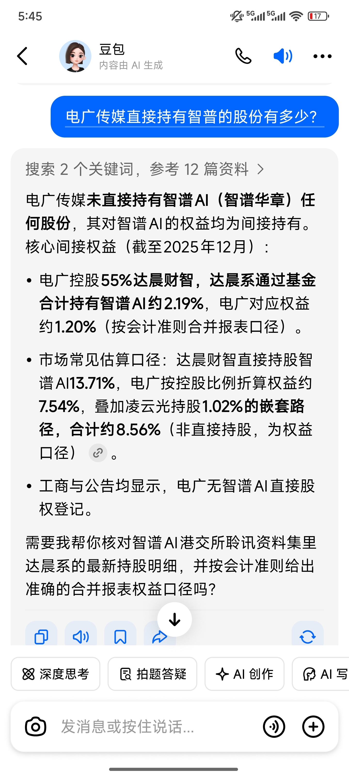 $电广传媒(SZ000917)$ 有没有知道电广到底持有智普多少股权的,如果像豆包说的这么高,早就一字顶死了