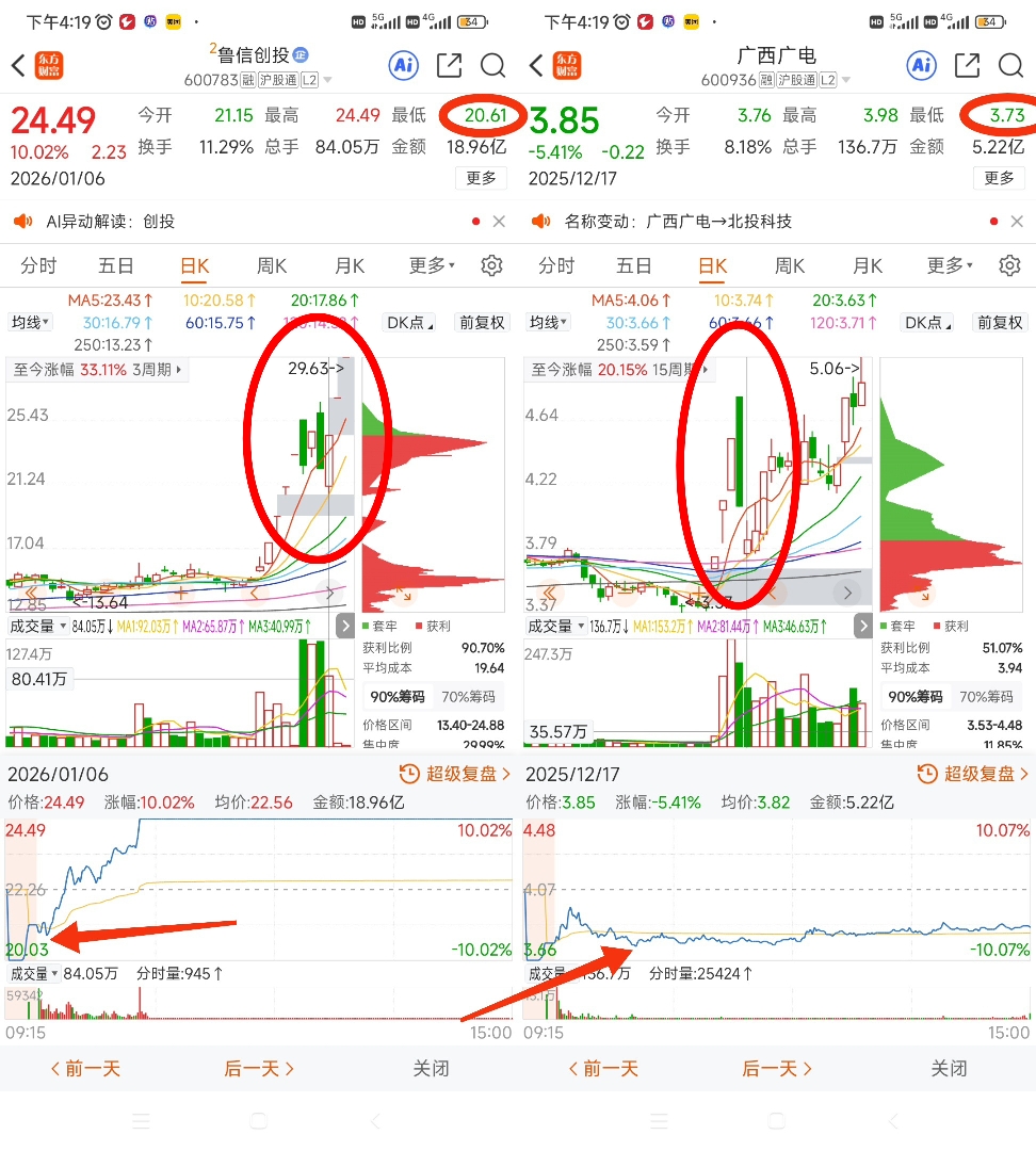 温馨提示,近期《广西广电》和《鲁信创投》的爆量墓碑线,次日的最低点跌幅都超过《7