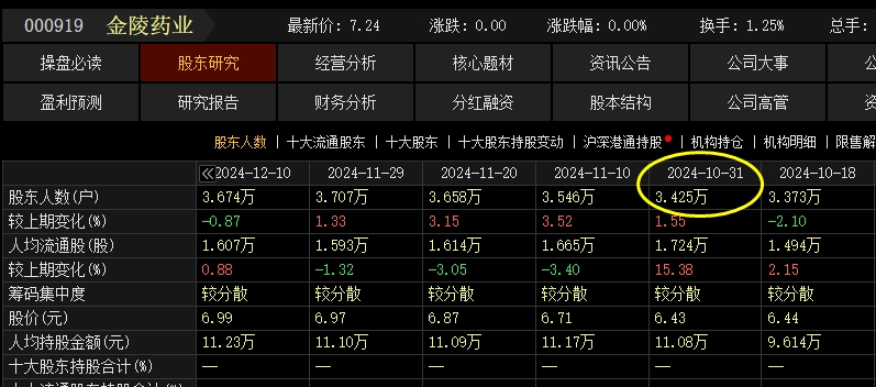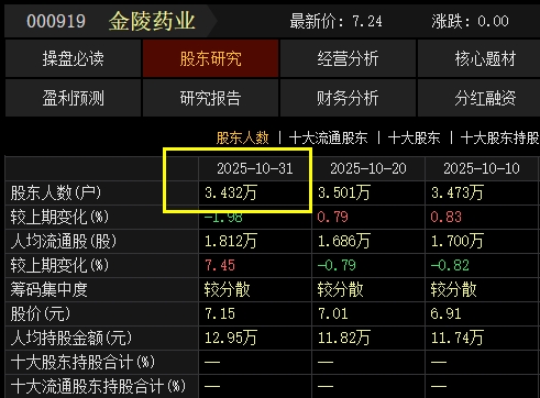 金陵药业2024年10月30日解禁以来,除去控股股东的限售股筹码没有卖出之外,其余8000万股参与定向增发的机构都已经清仓离场,但是为什么一年过去了,股东人数却没有增加呢?2024年10月31日的股东人数是34253人,2025年10月31日的股东人数是34317人,几乎没有变化,那我就问一个问题,8000万股定增的筹码都流到了谁的手里?