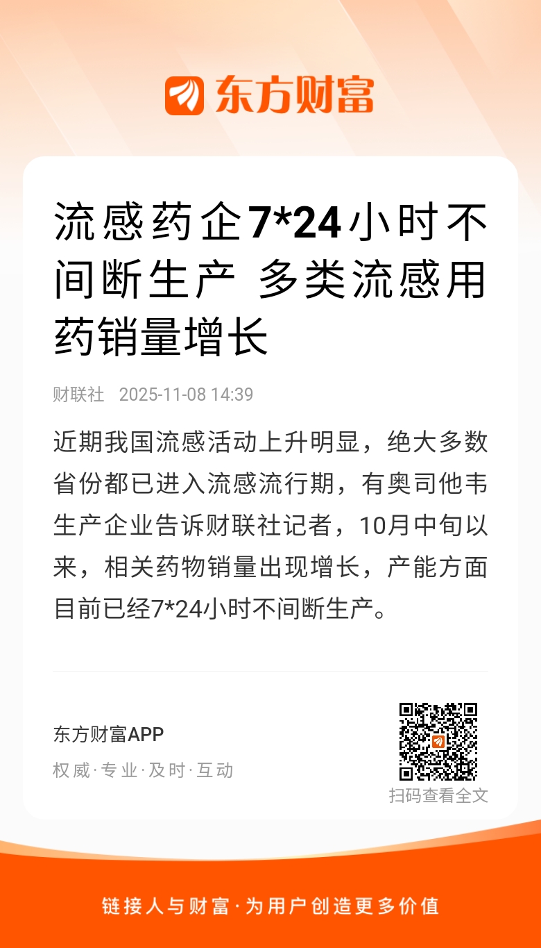 近期我国流感活动上升明显,绝大多数省份都已进入流感流行期,有奥司他韦生产企业告诉财联社记者,10月中旬以来,相关药物销量出现增长,产能方面目前已经7*24小时不间断生产。此外,国内多家RNA 聚合酶抑制剂生产药企回应称,相关产品商业化工作正稳步推进中,公司已采取多种措施以保证药物供应。小财注:中疾控最新数据显示,哨点医院门急诊流感样病例呼吸道样本检测阳性率排名中,今年进入秋冬季以来,流感病毒首次超越鼻病毒、呼吸道合胞病毒等跃居第一。