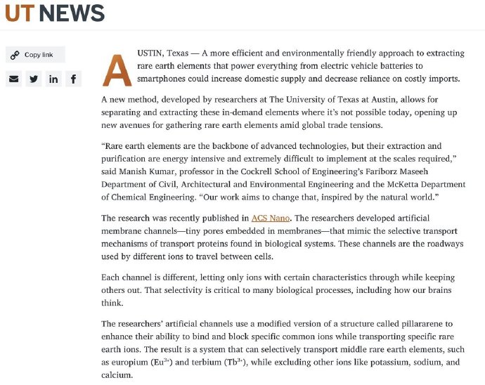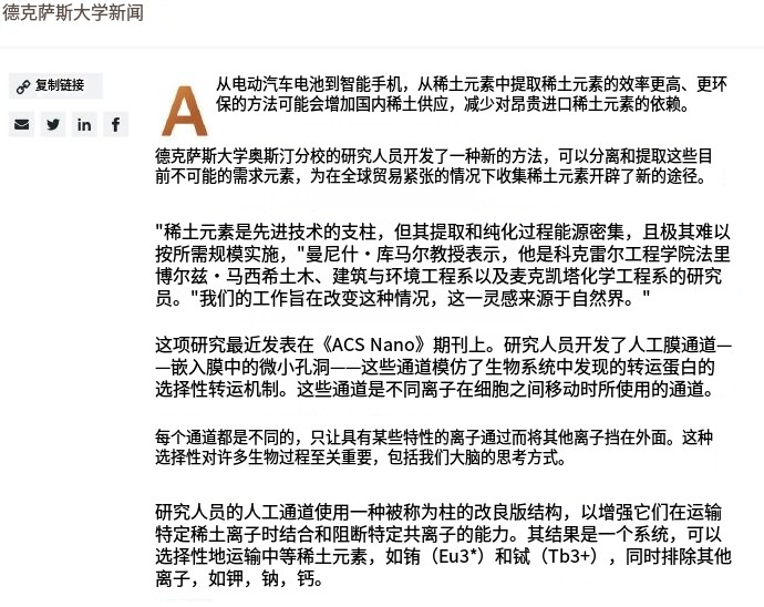 美国德州大学奥斯汀团队宣布采用了开创性的膜技术能高效、低污染地分离关键稀土元素