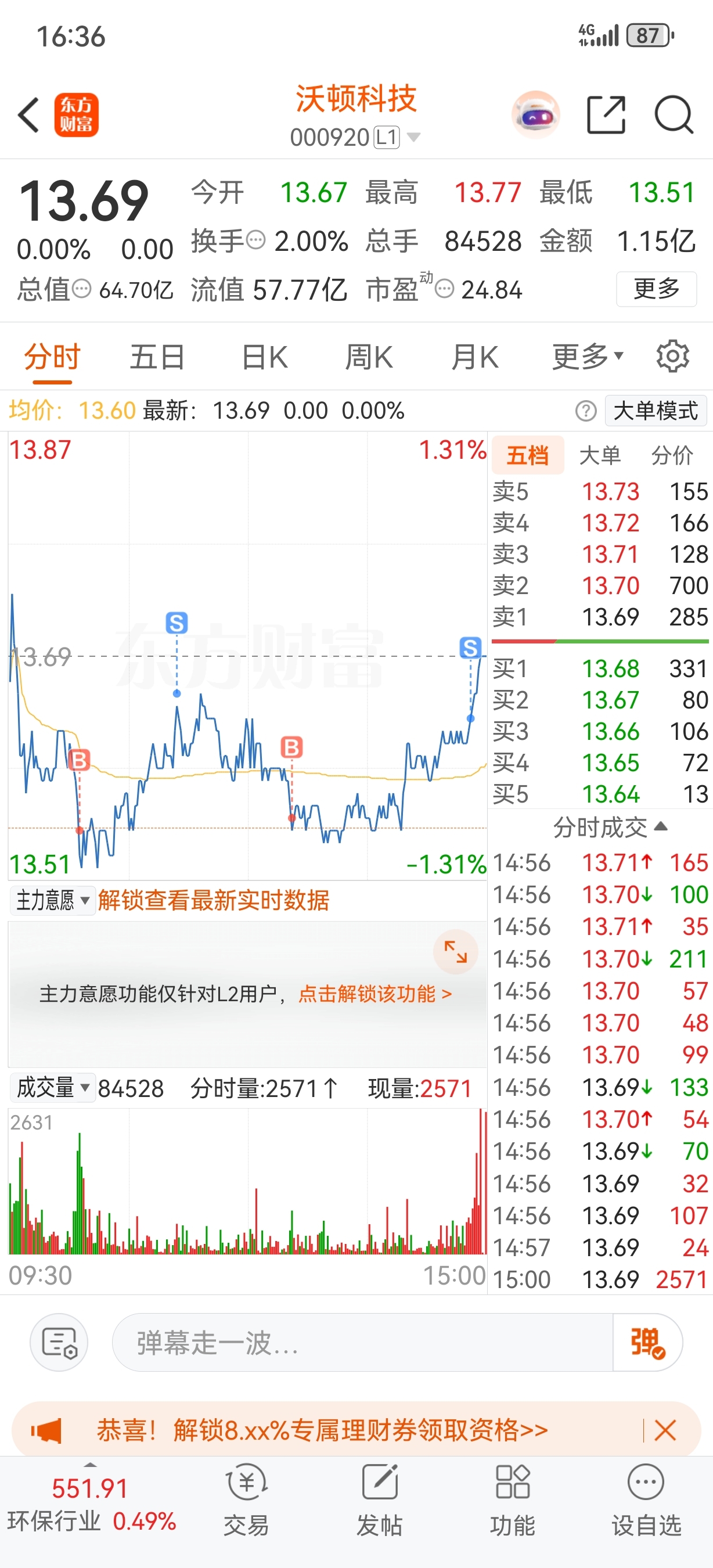 $沃顿科技(SZ000920)$ 可以做T了,今日成功做t一毛,拉尾盘拉,我必卖,尾盘偷袭!一路阴跌。TTTT,看你庄家怎么办。