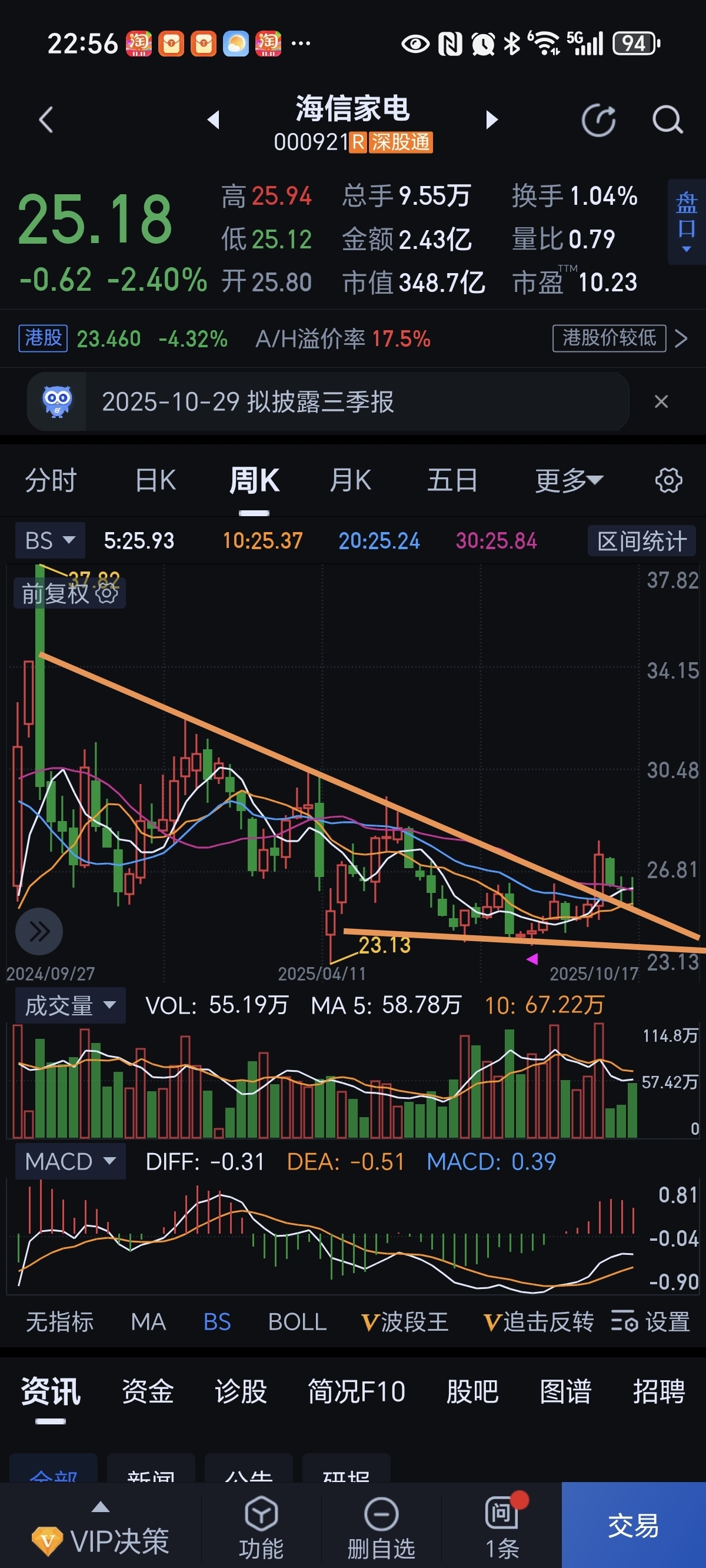 $海信家电(SZ000921)$ 从周线看上周下跌是对去年十月以来下跌趋势上轨的回踩,前两周周线收出一个缩量十字星和一个放量射击之星,如果下周能收出一个中阳,站稳26元以上,周线级别的上涨就开始了。坐稳扶好,风格切换已经开始,科技股将进入高位震荡,白马股补涨即将开始,筹码已高度集中,洗盘已完成,就等大盘突破,即将开启主升浪。