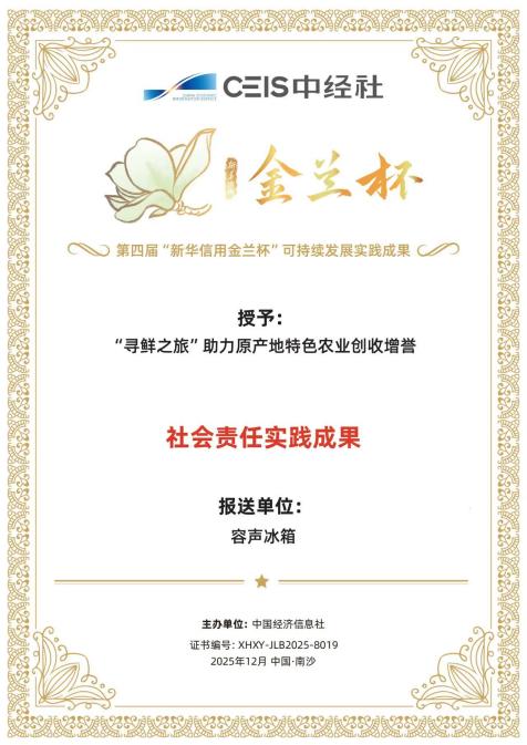 12月9日-10日,“2025明珠湾气候投融资大会”在广州市南沙新区举办。大会期间,第四届“新华信用金兰杯”可持续发展实践成果正式发布,容声冰箱《“寻鲜之旅”助力原产地特色农业创收增誉》实践入选社会责任实践成果。自2025年3月启动以来,容声冰箱“寻鲜之旅”先后走进北京昌平、云南陆良、宁夏中卫、四川绵阳等地,联合当地特色农产品区域公共品牌,开展多维度、深层次合作,助力当地农业发展和农民增收。
