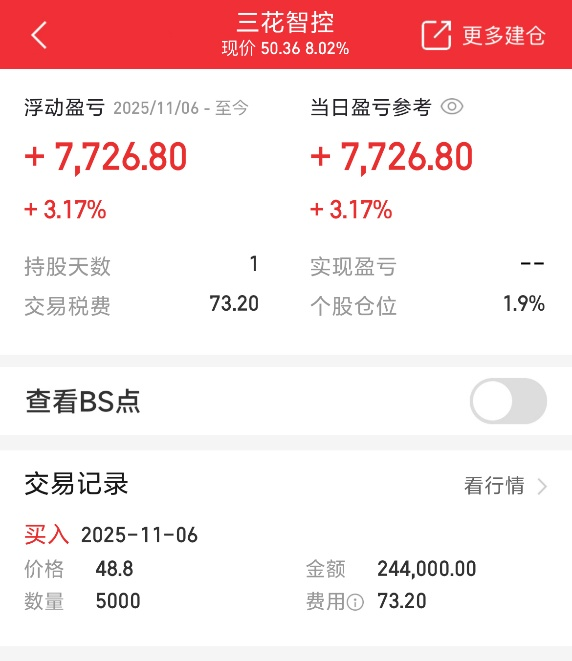 三花智控目前公司不仅是制冷空调电器零部件的全球龙头,公司前瞻性布局的机器人业务公司2025年前三季度实归母净利润同比增长超40%,业绩表现亮眼,目前核心催化剂是特斯拉O p t i m u s V 3预计2026年一季度推出。经过前几日的下跌,今天午盘,三花放量明显,冲破20日均线,和5日均线。刘哥也是乘机买入了。预计明天能够吃上。