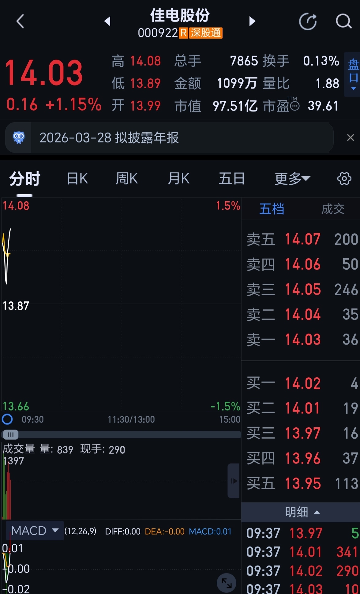 $佳电股份(SZ000922)$ 14元23w的买单,晃了一下就撤回了,典型的骗散户入场。主力无意的多,所以,遇到了拉升获利走人永远都是对的。远离烂泥
