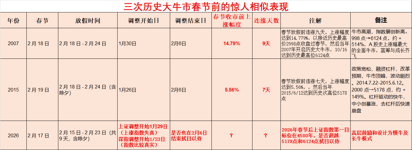 | 2026 | 2 月 17 日 | 2 月 15 日 - 2 月 23 日(共 9 天,含除夕) | 上证调整开始1月29日(上涨) 深指调整开始1/23日(指数比较真实) | 是否也在2月6日结束拭目以待 | 2026年春节后上证指数第一目标位在4500年,是否超越5178点和6124点拭目以待 | 高层鼓励和设计为慢牛及长牛模式 |