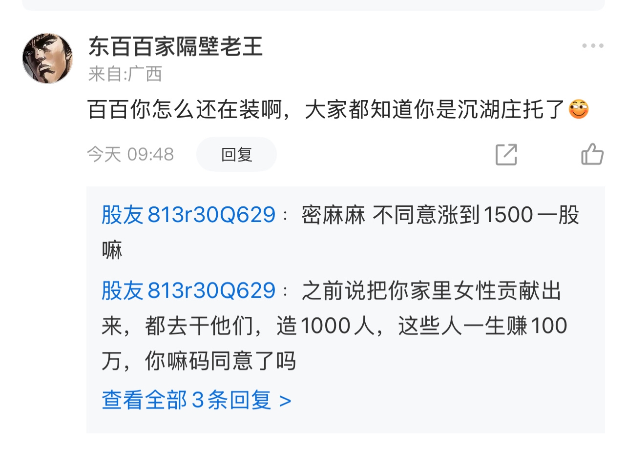 大家看沉湖庄托@股友813r30Q629如此气急败坏,是不是你们散户底部都不卖还