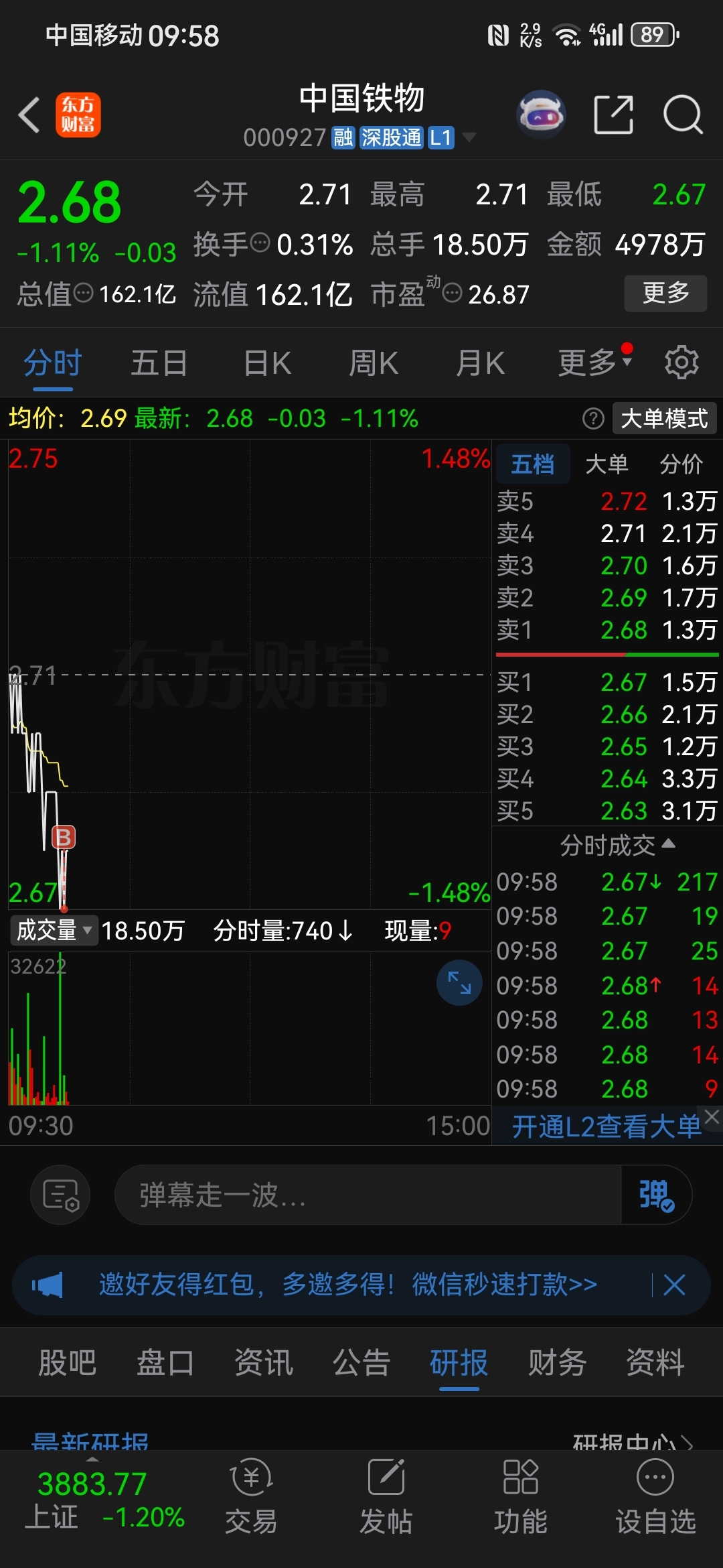 $中国铁物(SZ000927)$ 今天2.67开始建仓