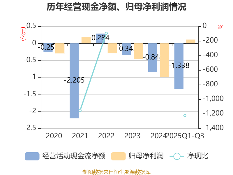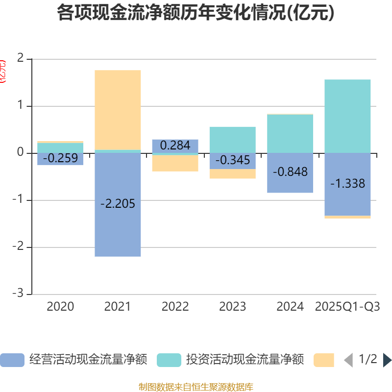 2025年前三季度,公司经营活动现金流净额为-1.34亿元,同比减少1.12亿元;筹资活动现金流净额-567.37万元,同比减少762.82万元;投资活动现金流净额1.56亿元,上年同期为3578.37万元。