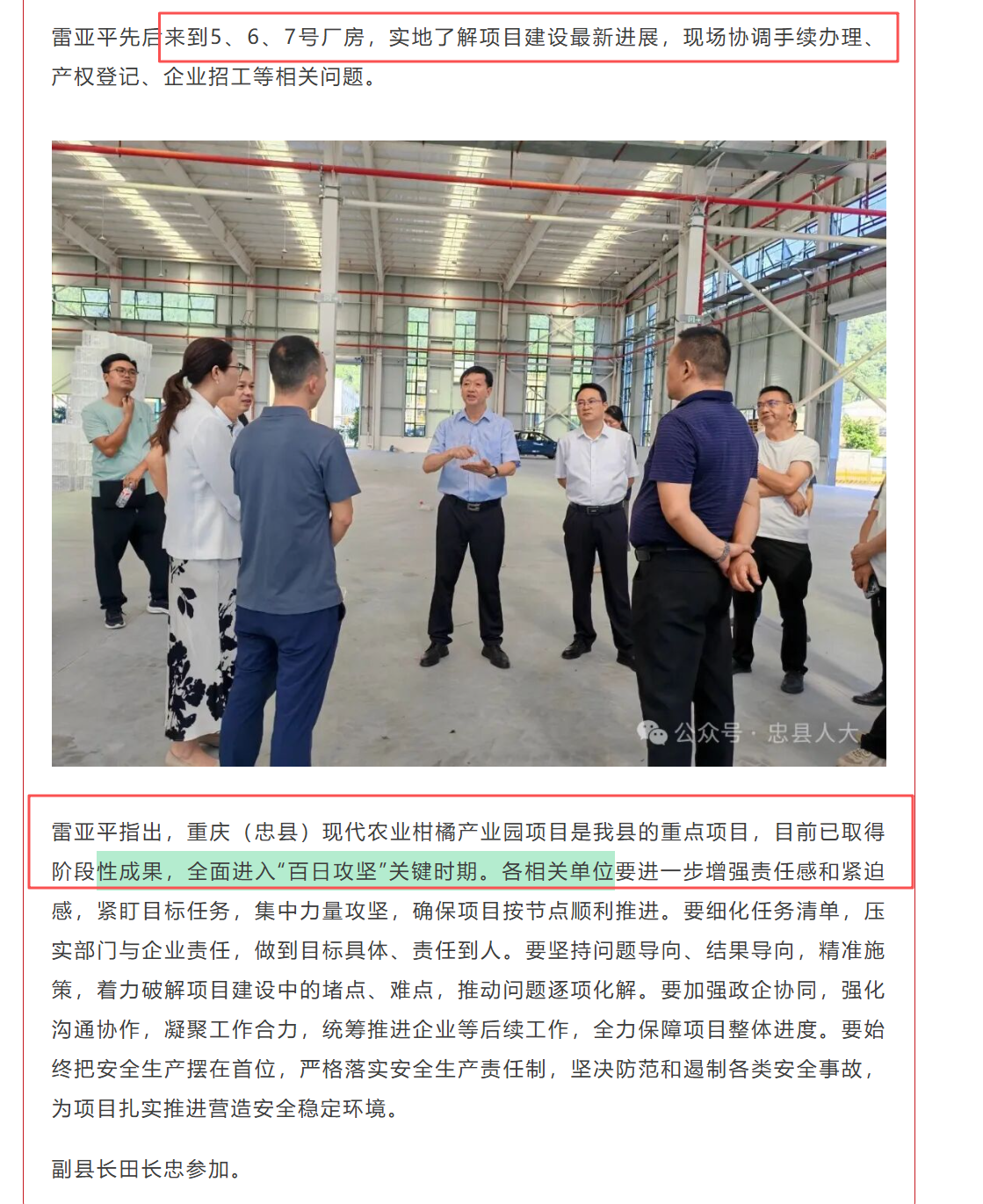 XX亲自盯项目,XX分别10月10日和10月16日,XX现场督导重庆(忠县)现代农业柑橘产业园项目推进情况。