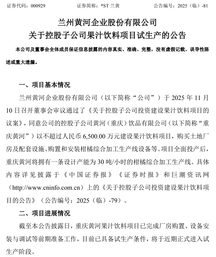 11月28日晚间,“西北啤酒王”*ST兰黄(000929)公告,公司于2025年11月10日召开董事会审议通过了《关于控股子公司投资建设果汁饮料项目的议案》,同意公司的控股子公司黄河(重庆)饮品有限公司(以下简称“重庆黄河”)以不超过6500万元建设果汁饮料项目,购买土地厂房及配套设施、购置和安装柑橘综合加工生产线设备等。项目全面投产后,重庆黄河将拥有一条设计产能为30吨/小时的柑橘综合加工生产线。