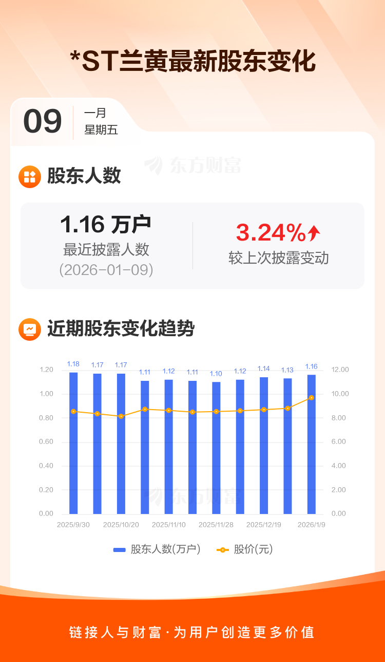 *ST兰黄:截至1月9日最新股东户数1.16万户,较上期增加3.24%