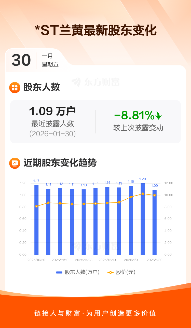 *ST兰黄:截至1月30日最新股东户数1.09万户,较上期减少8.81%