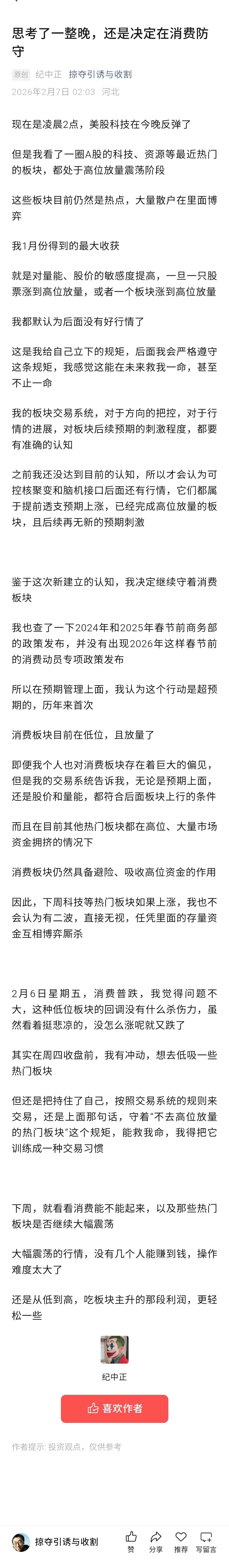 自己思考了12个小时,还是决定在消费防守
