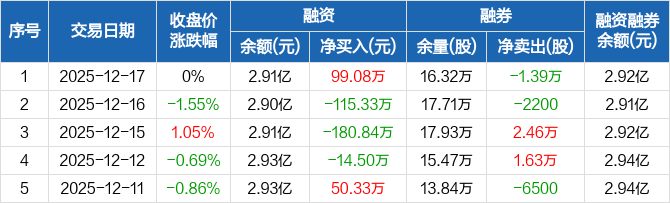 融资方面,当日融资买入515.79万元,融资偿还416.71万元,融资净买入99.08万元。融券方面,融券卖出1400股,融券偿还1.53万股,融券余量16.32万股,融券余额93.02万元。融资融券余额合计2.92亿元。