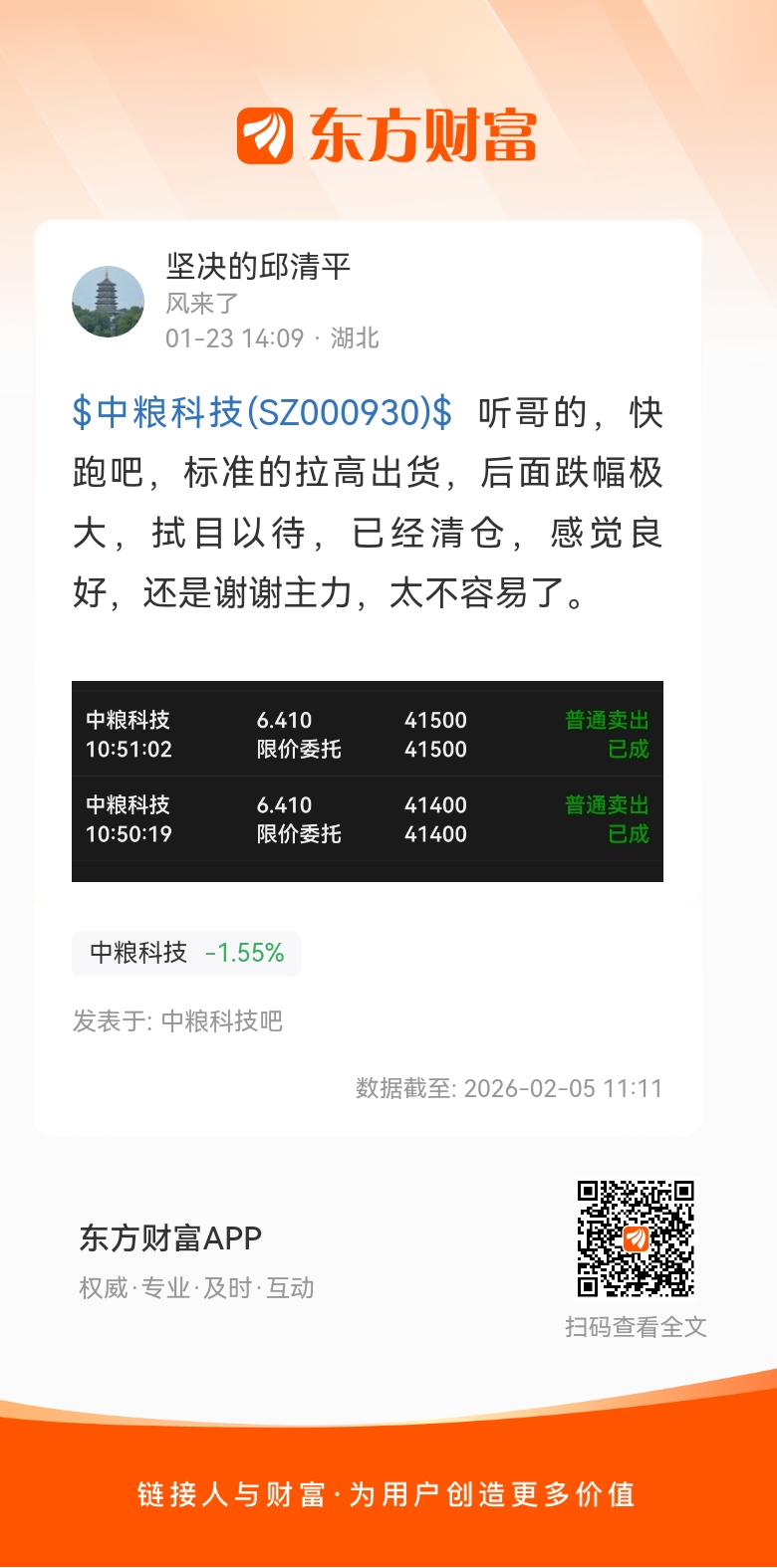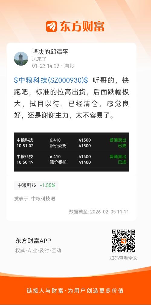 $中粮科技(SZ000930)$ 听哥的,快跑吧,标准的拉高出货,后面跌幅极大,拭目以待,已经清仓,感觉良好,还是谢谢主力,太不容易了。