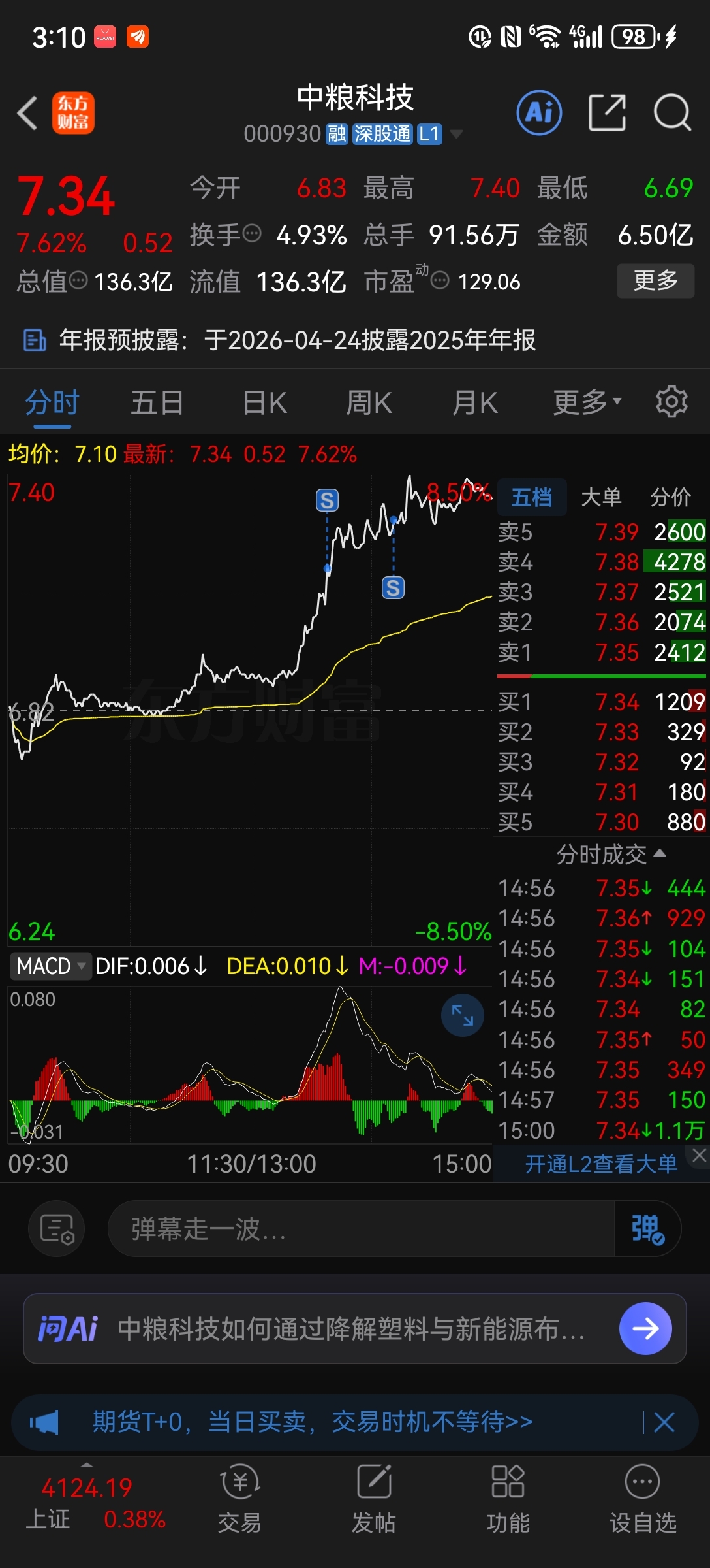 $中粮科技(SZ000930)$ 昨天抄底的,今天以均价6个点全部卖出,我赌你周一包跌的,跌下来五个点我再进去