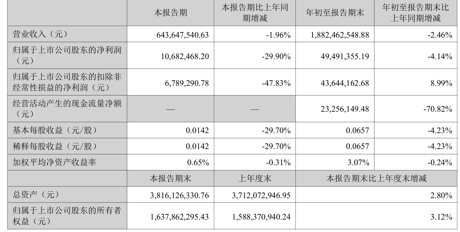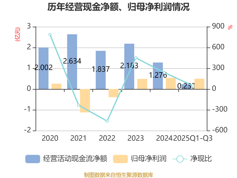 2025年前三季度,公司经营活动现金流净额为2325.61万元,同比下降70.82%;筹资活动现金流净额9834.55万元,同比增加9230.09万元;投资活动现金流净额-7867.31万元,上年同期为-9245.98万元。