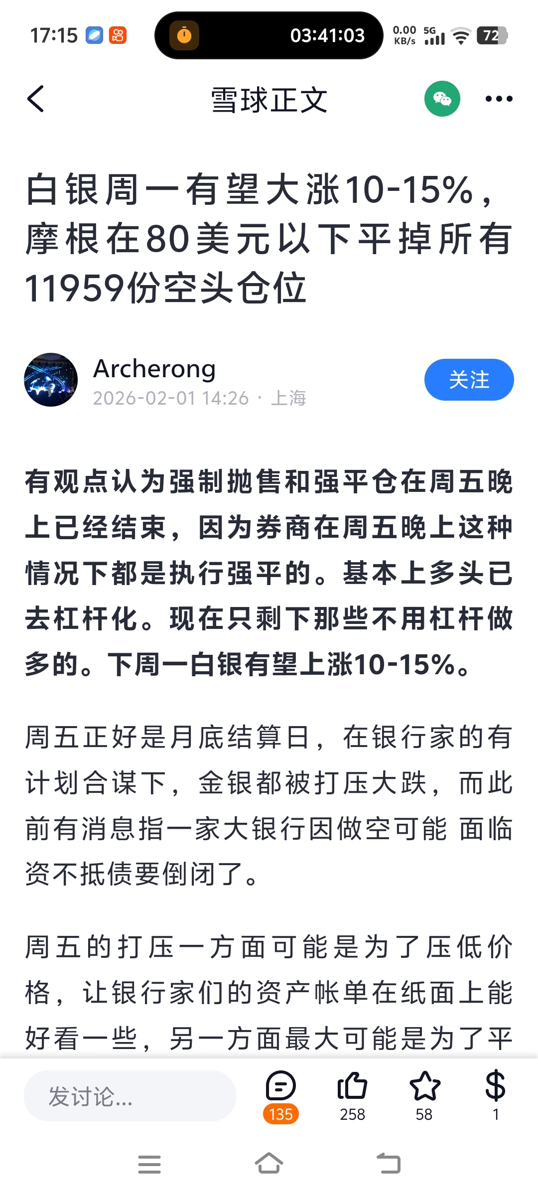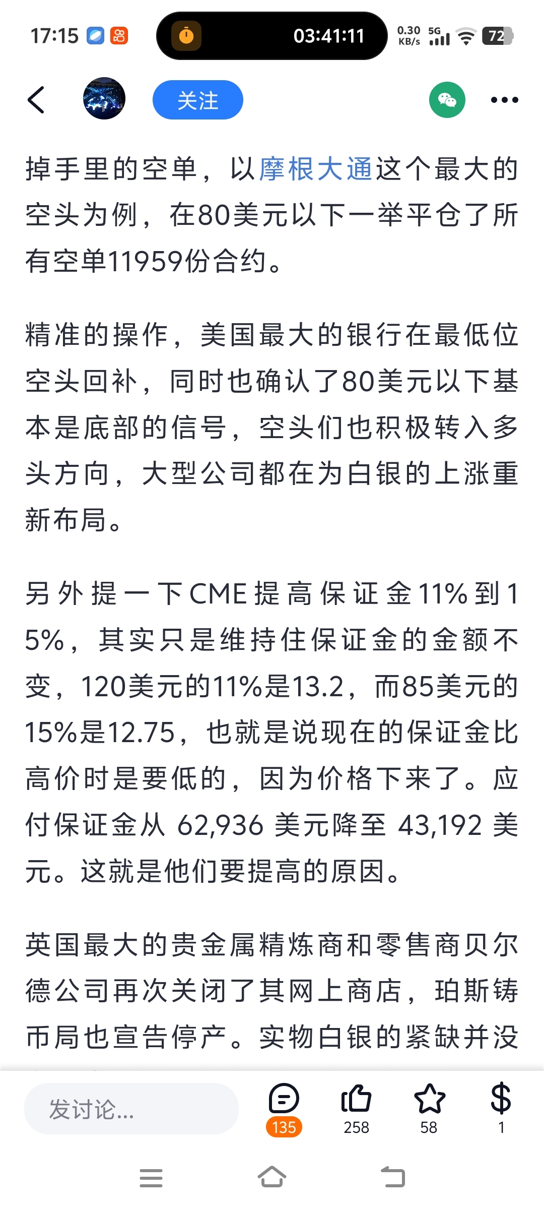昨天晚上热度排名第二的是大VA神写的一个帖子,预测今天白银会至少涨10个点以上。