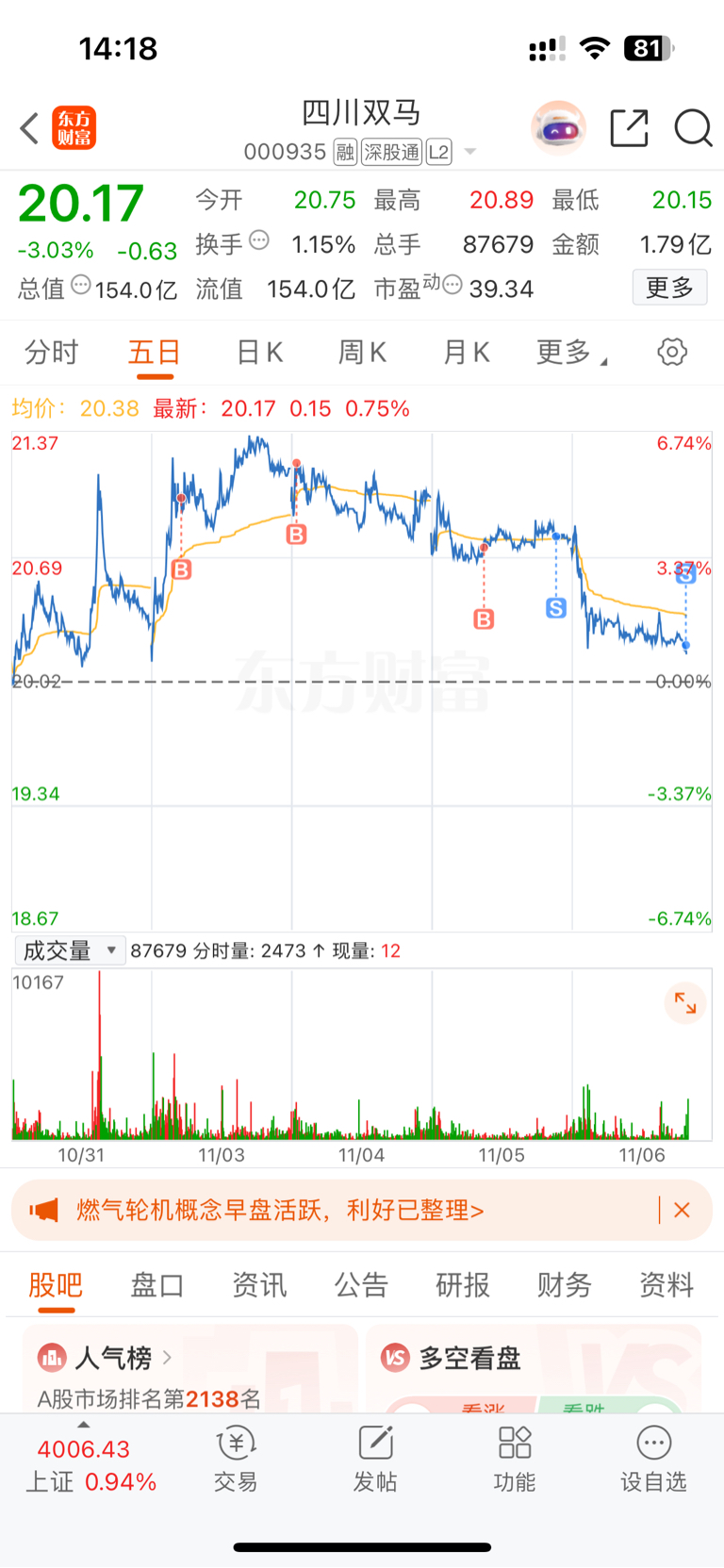 $四川双马(SZ000935)$ 跑了,三天亏5个点