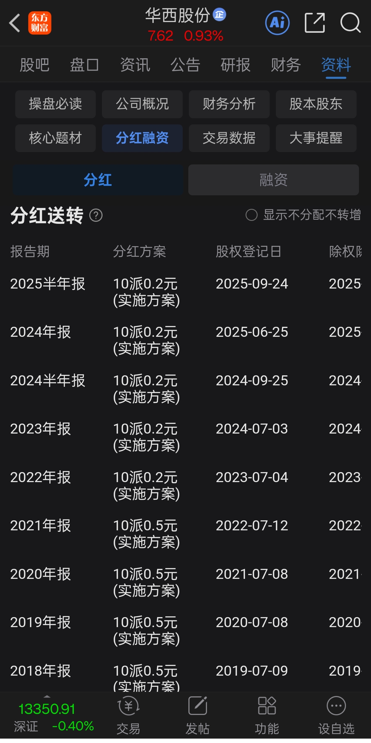 $华西股份(SZ000936)$ 公司抠门到极致,2毛2毛的分红咋想的呢?